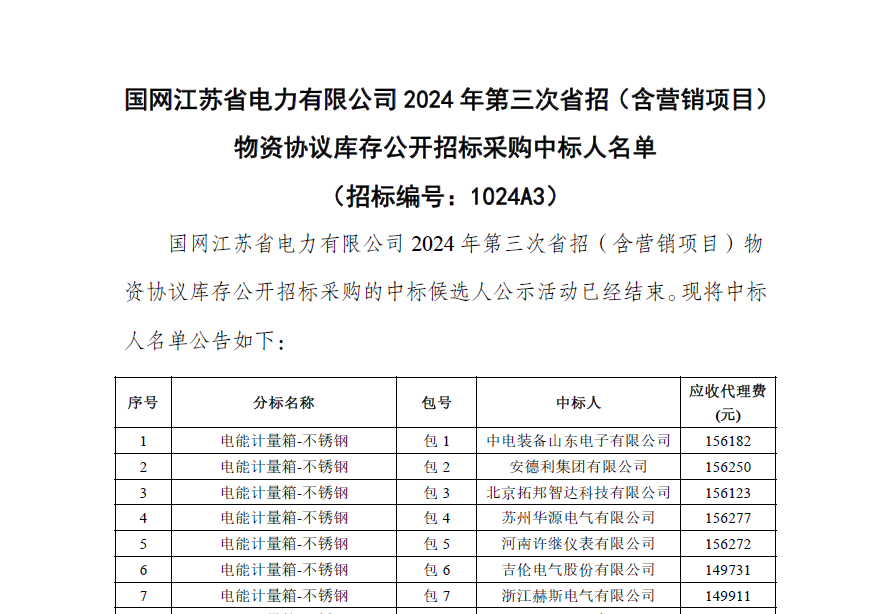 【中標喜訊】熱烈祝賀我司中標國網(wǎng)江蘇省電力有限公司2024年第三次省招(含營銷項目)物資協(xié)議庫存公開招標采購項目